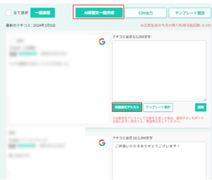対象の口コミ箇所の「AI返信文アシスト」をクリック。