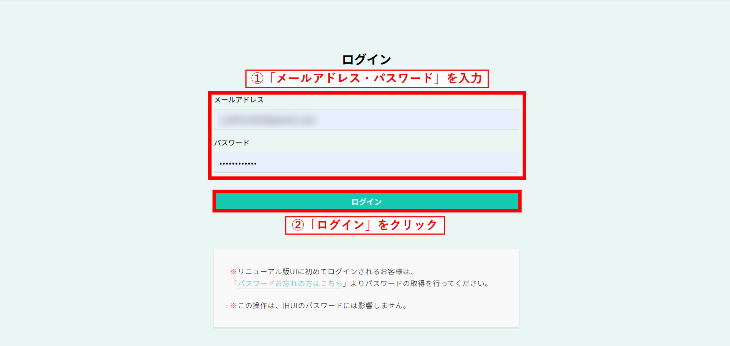 ログイン画面にて「メールアドレス」「パスワード」を入力し、最終にログインをクリックすればログインが可能です。