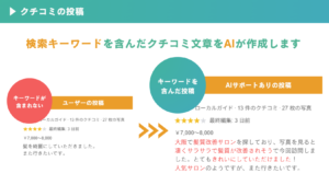 ただ、ユーザーの多くが「文章を考えるのが手間…」と思って口コミをしてくれないことや、書いてくれてもMEOとして有効なものにならないこともしばしばあります。