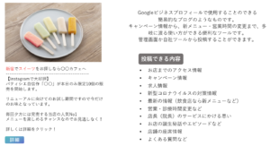 検索への対策としてキーワードを入れ込むことや、ユーザーにも店舗の活動をリアルタイムに伝える効果があります。