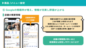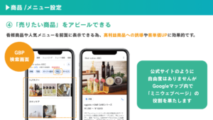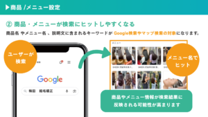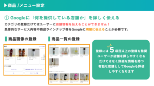 GBPの充実の中で、商品・メニューを追加することはよりユーザーに店舗の詳細を伝えるために有効です。画像だけでは伝わらない訴求を行って、よりクオリティを上げていきましょう!