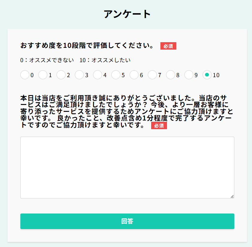 - 質問内容:テキスト、10段階評価から選択