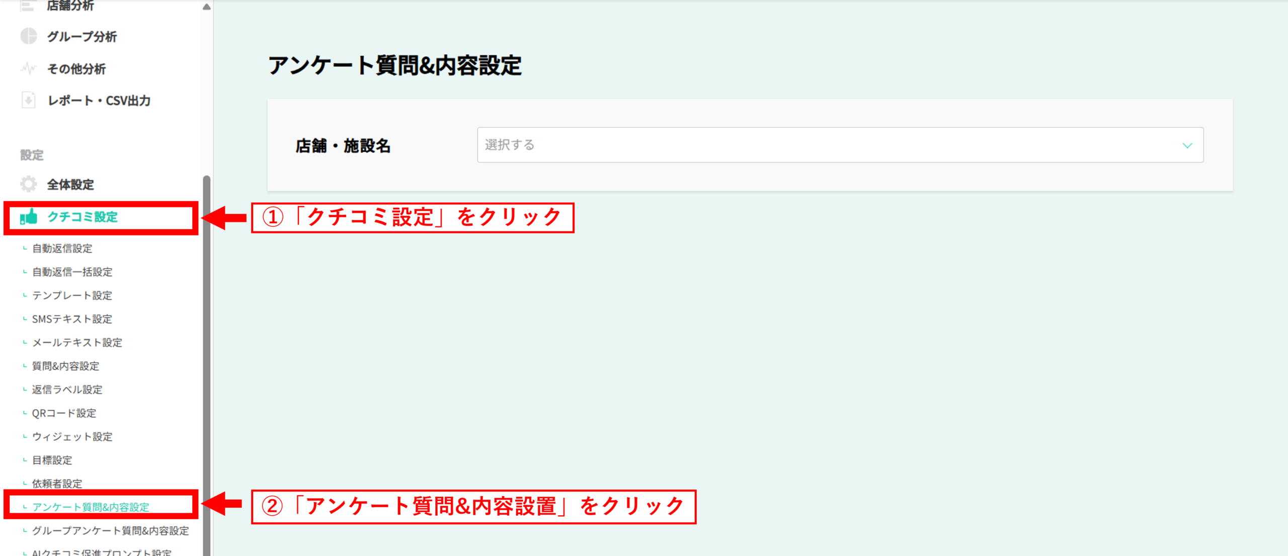 - クチコミ設定>アンケート質問&内容設置をクリックします。