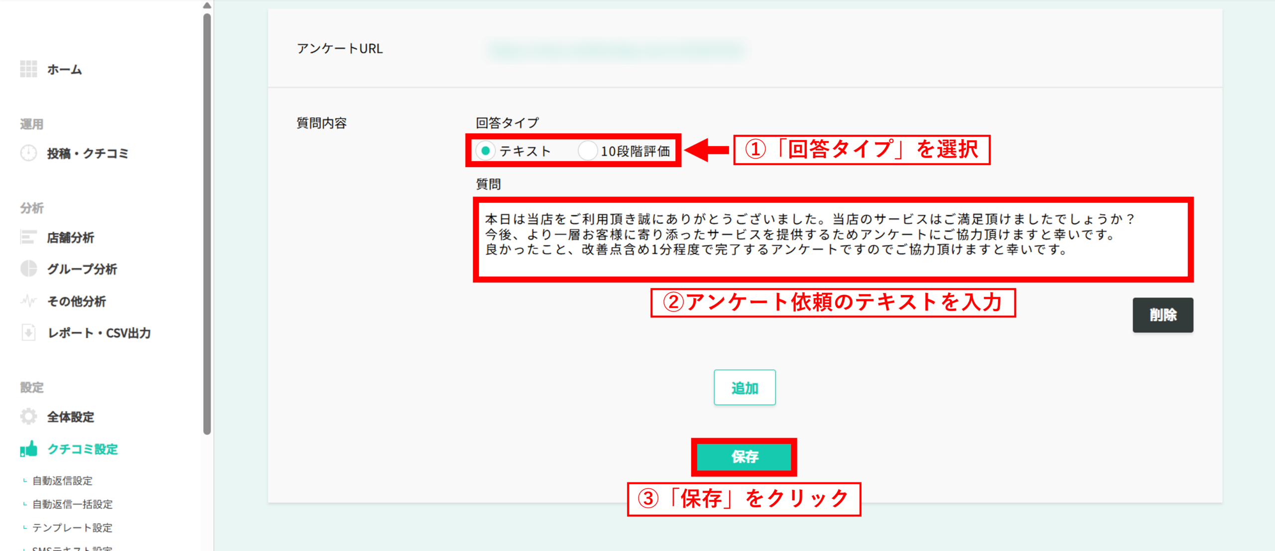 - 回答タイプを選択し、アンケート依頼のテキストを入力した後に「保存」をクリックします。